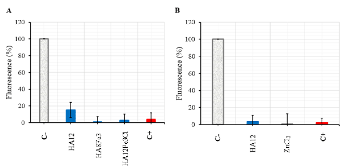 In the present study, the compounds HA12, HA8Fe3, HA12Fe3Cl with 250 µM and cetrimide with 5.9 µM (2 µg/mL) treating S. aureus gave low percentage values of fluorescence: 15.16%, 0.77%, 2.88% and 4.03%, respectively (Figure 2A).A similar sharp decrease in percentage fluorescence values was also observed for the compounds HA12 and ZnCl2 at 250 µM against E. coli (3.26 and 0.69%, respectively) (Figure 2B).