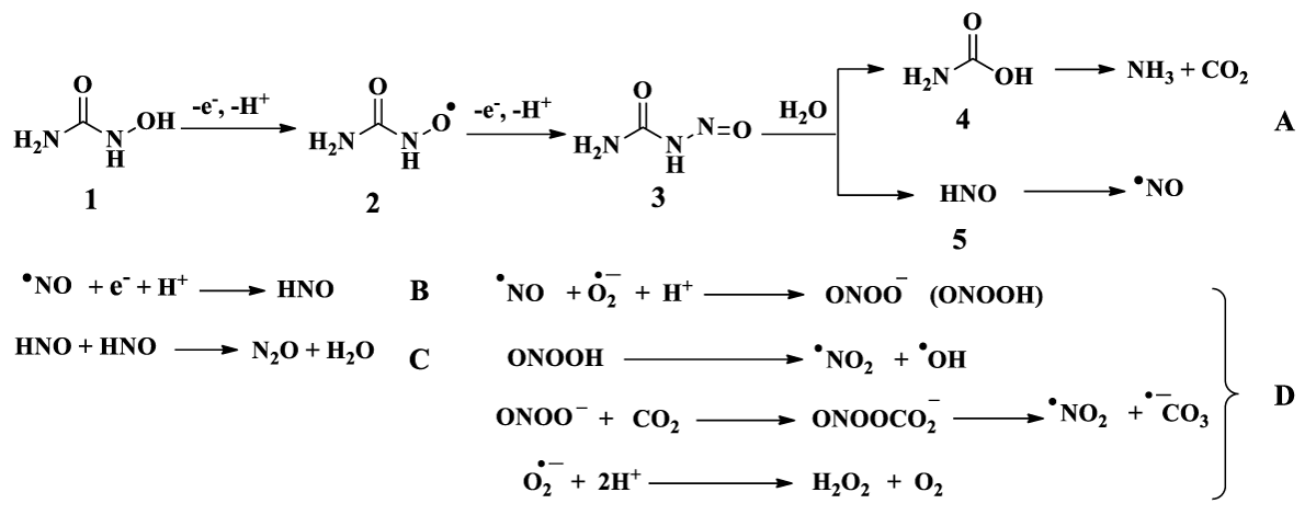 Given the potential value of HA as a therapeutic agent, it would be interesting to understand how NO is released from HA under physiological conditions. It still remains unclear whether it is formed via oxidation of hydroxyurea (1) by heme proteins using hydrogen peroxide (H2O2) (Scheme 2A) [6,10] or by occurrence of other reactions; including the direct release of NO from the nitroxide radical (2) and the dimerisation of nitroxyl HNO (5) to generate nitrous oxide (N2O) (Scheme 2B, 2C) [6,10]. The formation of anionic and radical species (the peroxynitrite anion (ONOOˉ), nitrogen dioxide (•NO2), carbonate anion (CO3•ˉ), and hydrogen peroxide (H2O2) (Scheme 2D) [6].