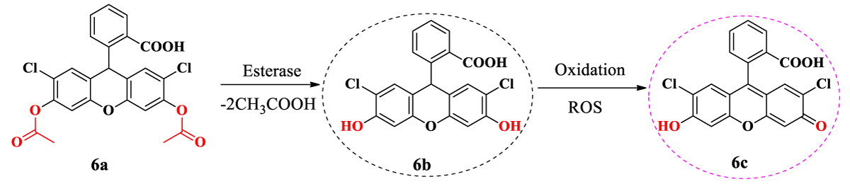 The DCFDA (6a) is a non-fluorescent dye, which is hydrolysed intracellularly by esterases into its polar but non-fluorescent form (6b). The compound 6b was oxidated to produce ROS and other intracellular peroxides transformations were obtained in the highly fluorescent form (6c, Scheme 3)[17]. Here, we tried to determine the ROS production in bacteria (S. aureus and E. coli) treated by compound 6a. The control groups in the presence and absence of compounds (negative control) were also performed. Fluorescence was recorded on a fluorescence spectrophotometer and expressed as a percentage of fluorescence to the negative control.
